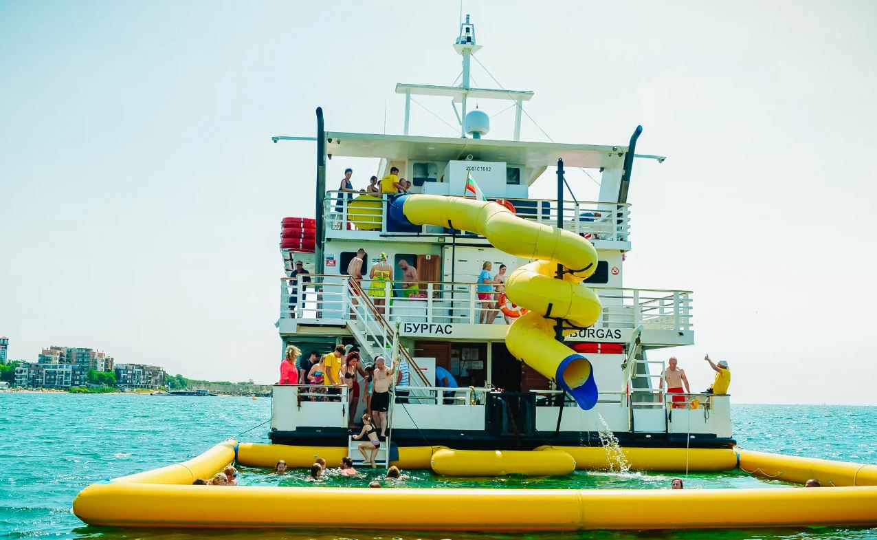 09:30 Отплаване с Катамаран Sea Star. Среща с пиратите . Богата анимационна програма. Катамарана плава бавно по крайбрежието на Сл.бряг и хвърля котва. Къпане в морето, водна пързалка на борда. Обяд и напитки на кораба .