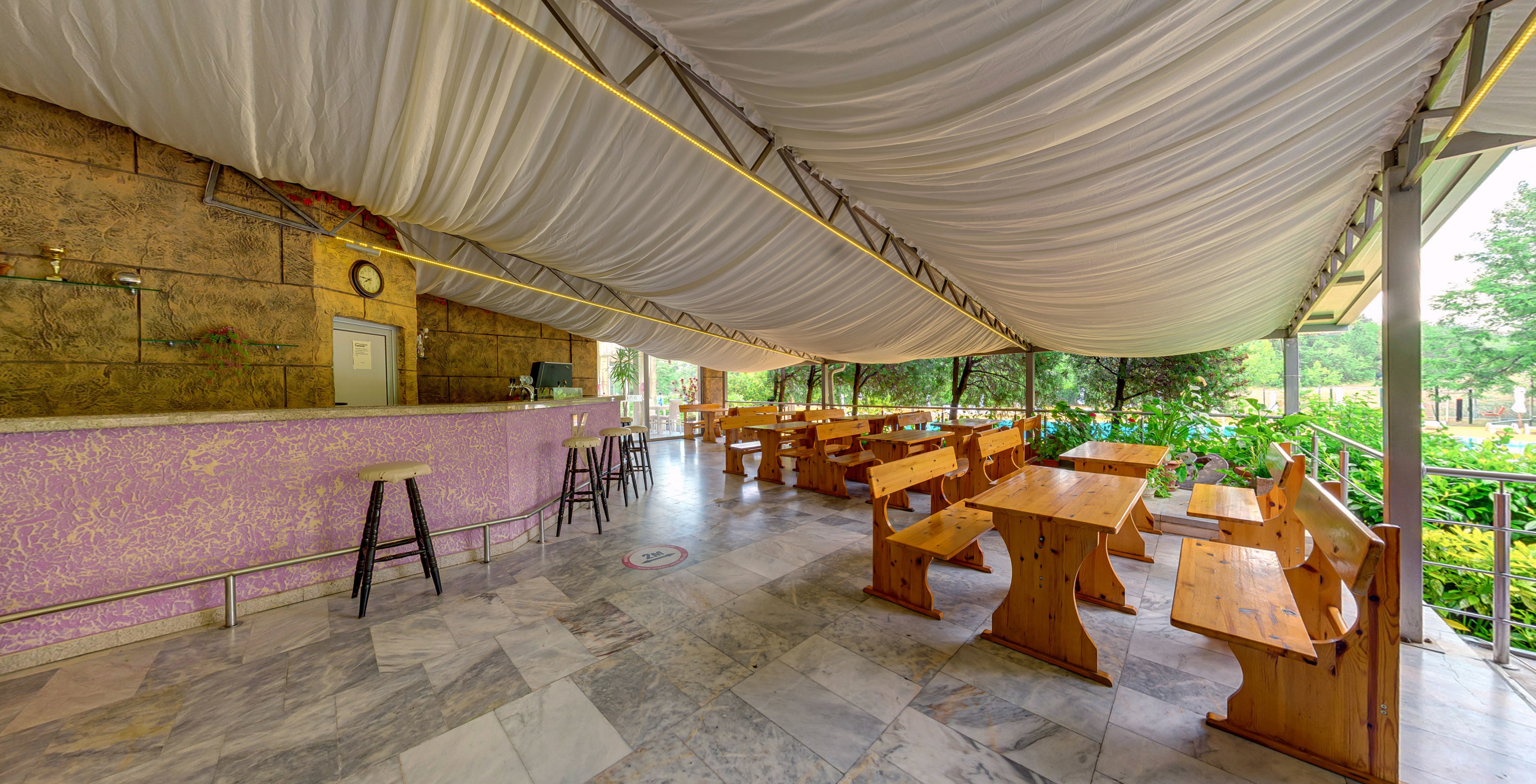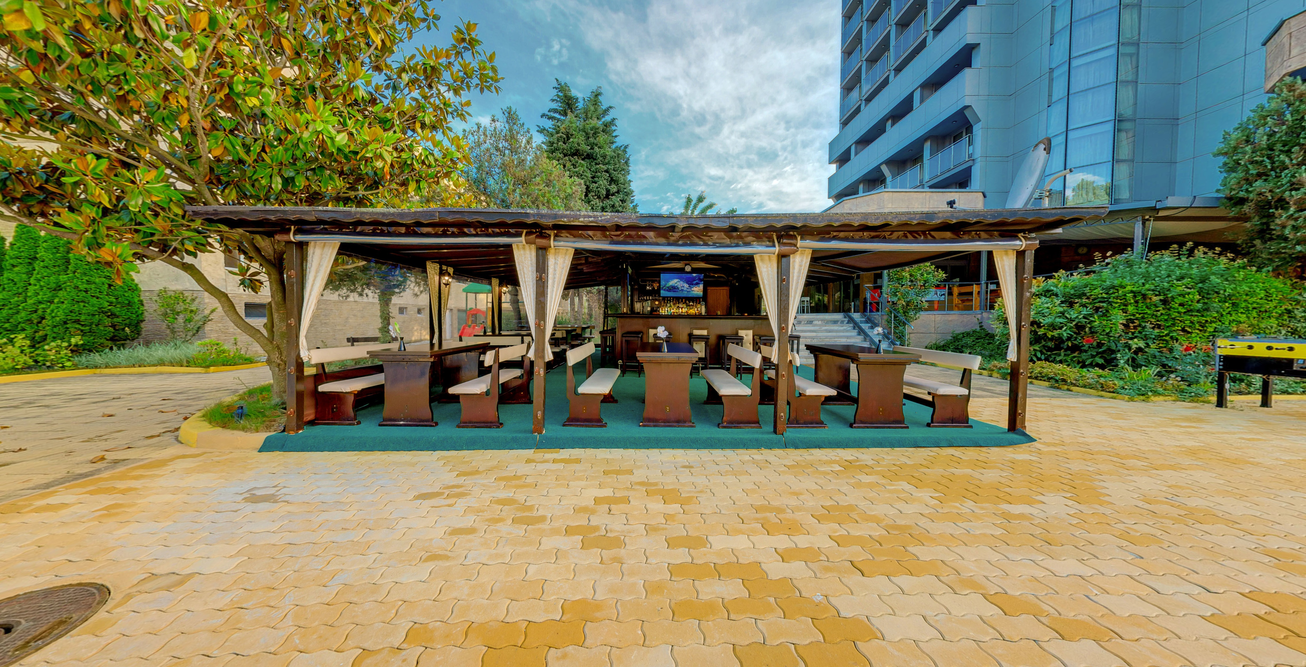 бар край басейна, шезлонги и чадъри край басейна и открита детска площадка. На