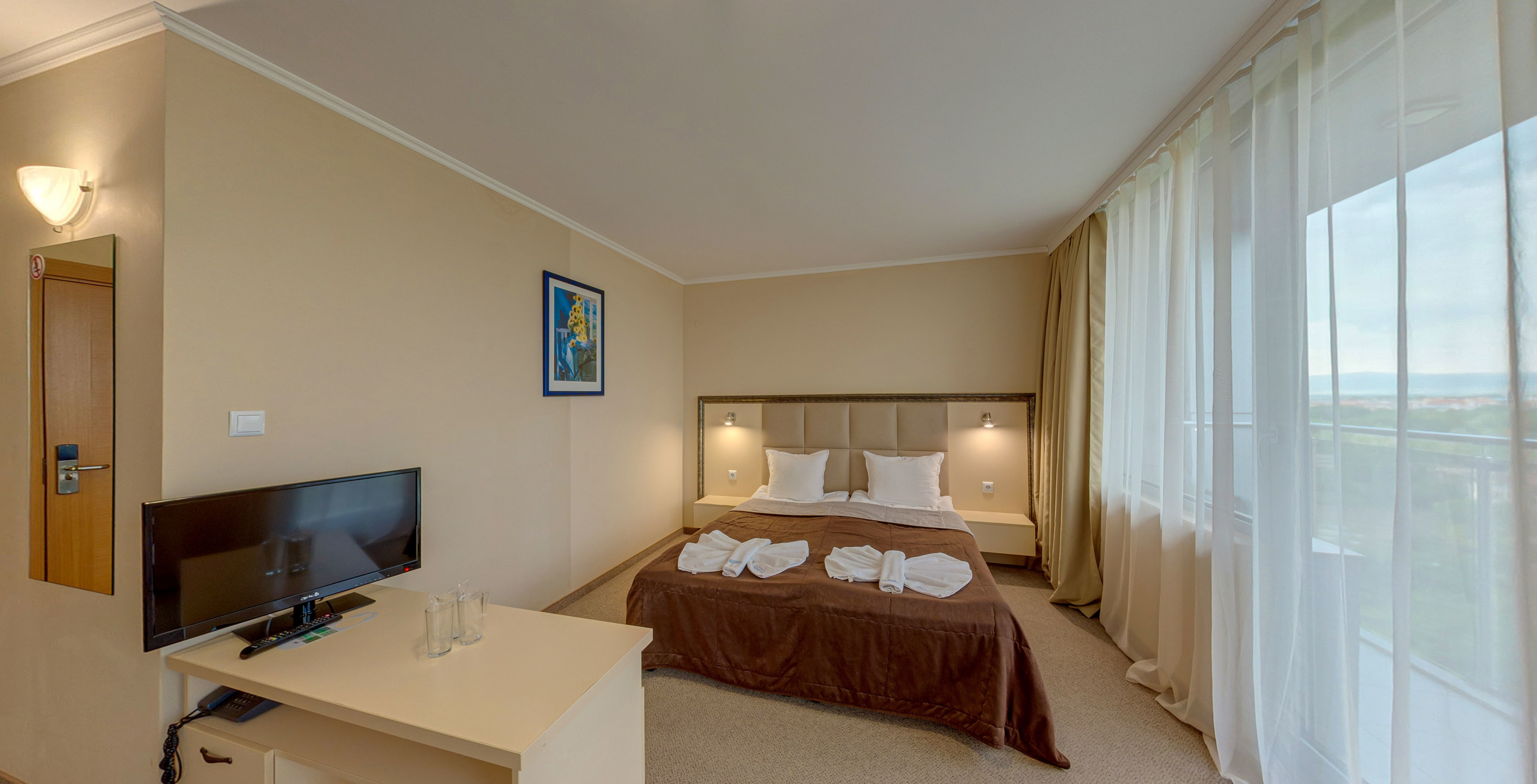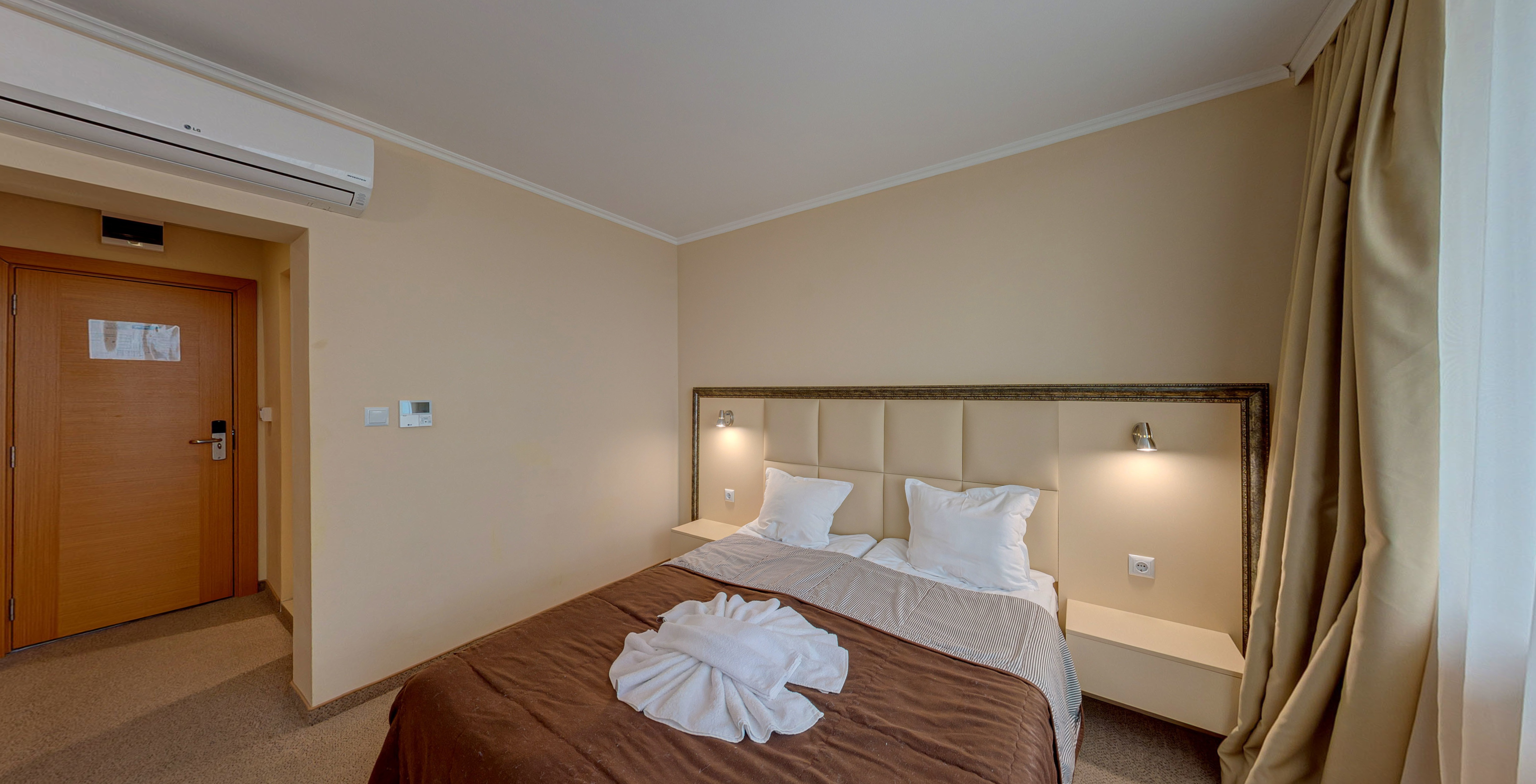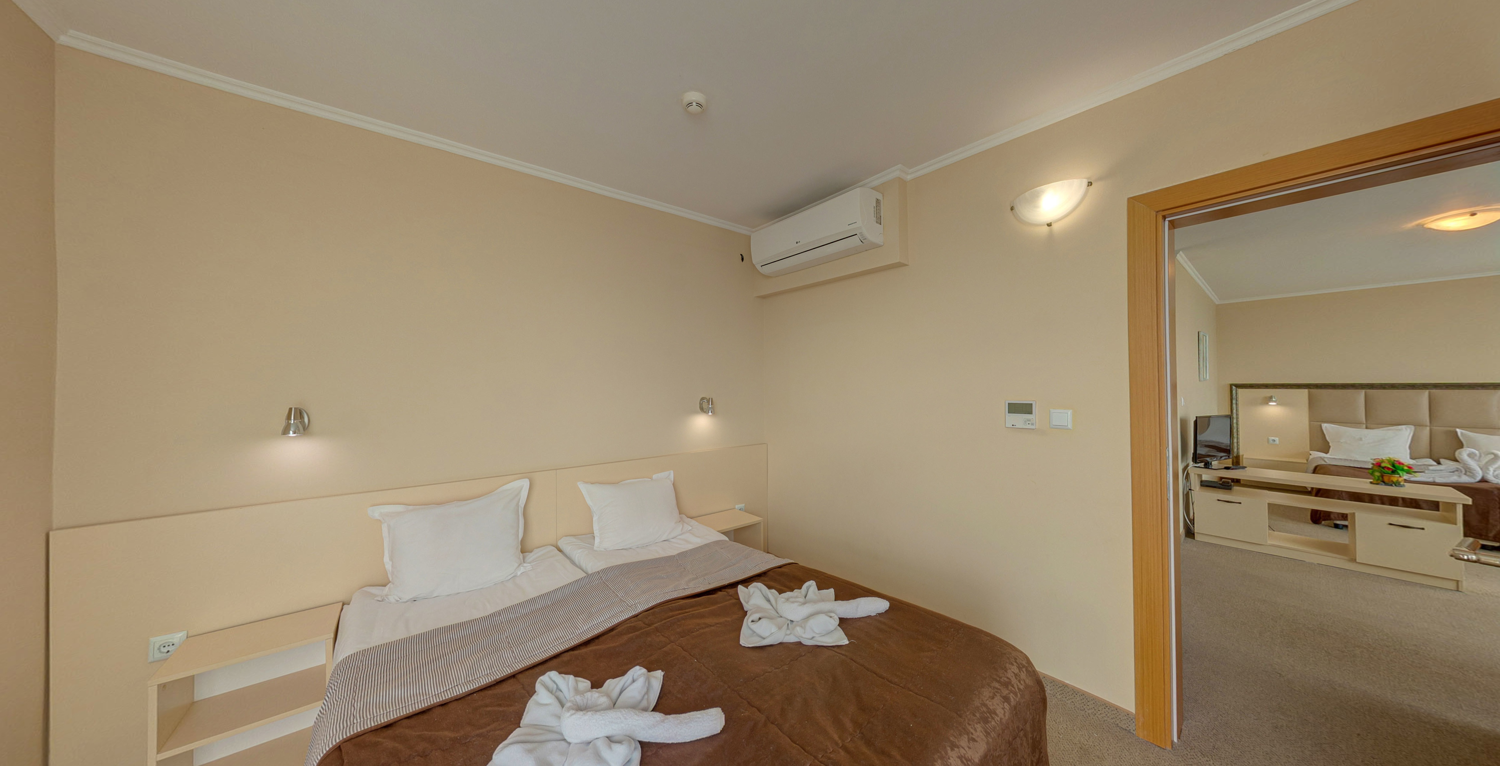 Апартаменти: състоят се от две стаи, разделени с врата – едната стая с 2 единични легла + хол с дивани, а другата стая, спалня. климатик, хладилник, LCD телевизор, Wi-Fi, баня и тоалетна, сешоар и балкон.