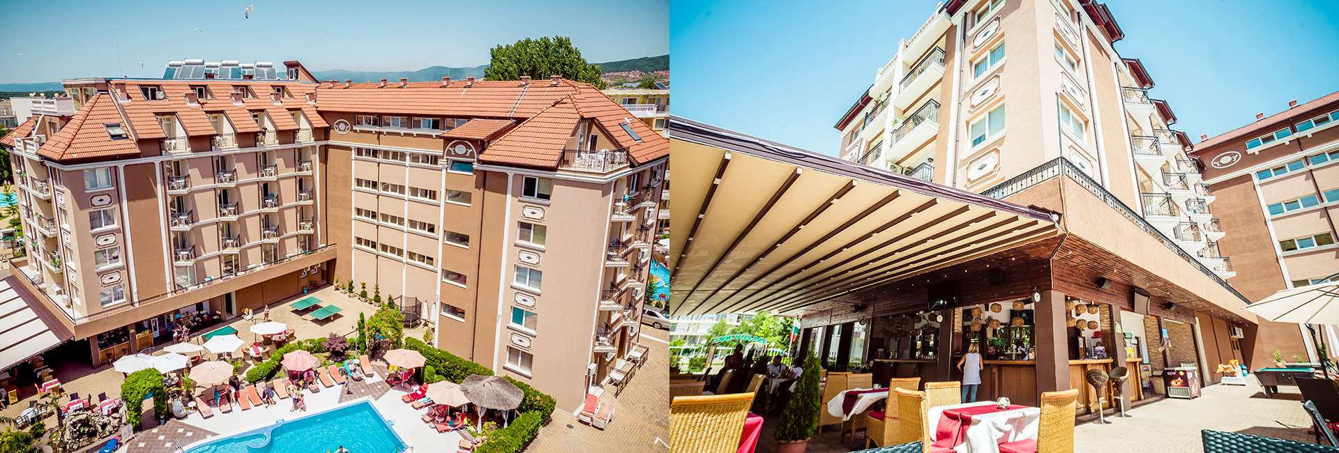 хотела: рецепция 24 h,асансьор, ресторант, двор с открит басейн,чадъри и шезлонги край басена ,бар на басейна,сейф- /