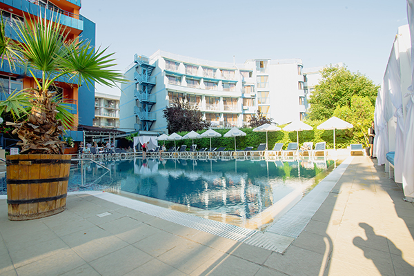 на територията на хотела, открит басейн с шезлонги и чадъри ,зона за релакс,ресторант