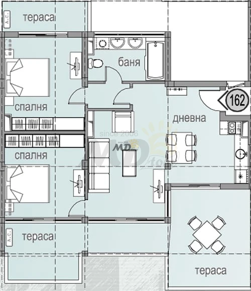 Страхотен апартамент с две спални на метри от плажа в Свети Влас. Светли просторни стаи и големи тераси. Панорама към морето